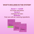 Serum 1 CLEAR: AQUA, THIOGLYCOLIC ACID, CYSTEAMINE HCL, CETEARYL ALCOHOL, AMMONIUM HYDROXIDE, PROPYLENE GLYCOL, ETHANOLAMINE, PARAFFINUM LIQUIDUM, ETHYLHEXYL STEARATE, SODIUM ERYTHORBATE, ETHYLHEXYLGLYCERIN, HYDROLYZED COLLAGEN, POLYQUATERNIUM-22, CETEARETH-20, HYDROLYZED KERATIN, DISODIUM EDTA, PHENOXYETHANOL, PARFUM, CITRIC ACID, CETRIMONIUM CHLORIDE, LIMONENE, LINALOOL.