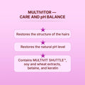 • Мультивітор завершує процедуру ламінування. CERAMIDE A2 у поєднанні з екстрактами сої, пшениці, бетаїном і амінокислотами інтенсивно живить і відновлює волоски, а також допомагає нормалізувати природний pH шкіри після впливу попередніх етапів.
